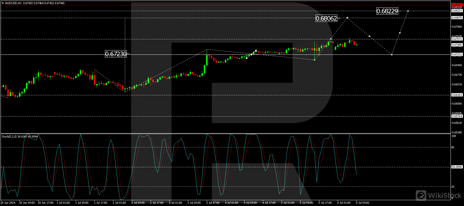 The AUD/USD pair is currently challenging the 0.6757 level, with the potential to extend the rally towards 0.6806. Following this target, a pullback to 0.6757 could occur, setting the stage for another rise to 0.6822. The stochastic oscillator, situated above the 50 mark, suggests an imminent climb to 80, reinforcing the bullish momentum forecasted.