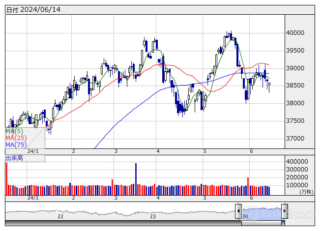 シカゴ日経225先物 (円建て) 38495 ( -345 )