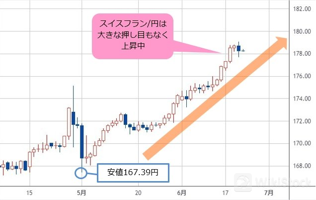 スイスフラン/円の日足を振り返れば、日銀の大規模介入が入ったときの安値が167.39円(5月1日)。