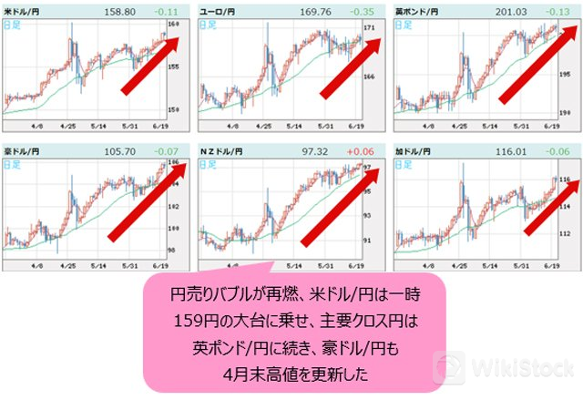 「円売りバブル」が再燃し、米ドル/円は一時159円の大台に乗せた。主要クロス円(米ドル以外の通貨と円との通貨ペア)では、英ポンド/円に続き、豪ドル/円も4月末高値を更新し、円安トレンドが強化されている。