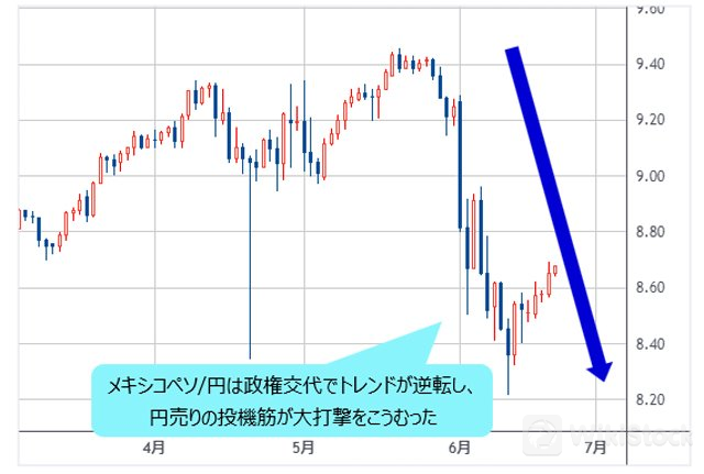 最近の好例はメキシコペソ/円だ。政権交代でトレンドが逆転し、円売りの投機筋が大打撃をこうむり、円売りさえすれば儲かる、というロジックが通用しなくなってきた前兆ではないかとみる。