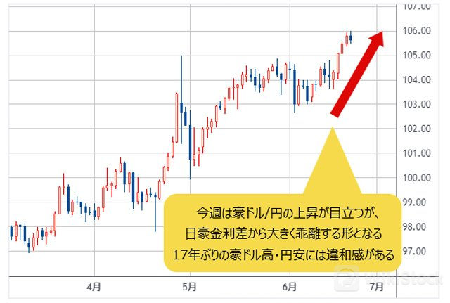 今週(6月17日~)は豪ドル/円の上昇が目立つが、前述のように日豪金利差から大きく乖離する形となる17年ぶりの豪ドル高・円安を正当化できるかと聞かれると、かなり違和感がある。