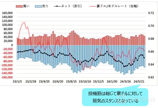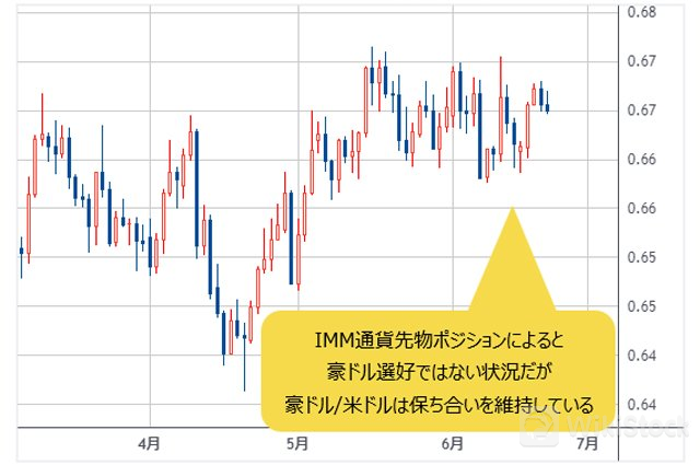 なぜなら、豪ドル/米ドルは保ち合いを維持しているが、IMM通貨先物ポジションに照らして考えると、投機筋は総じて豪ドルに対して弱気のスタンス(ネットでは売り越し)を取っており、豪ドル選好ではないことがわかる。