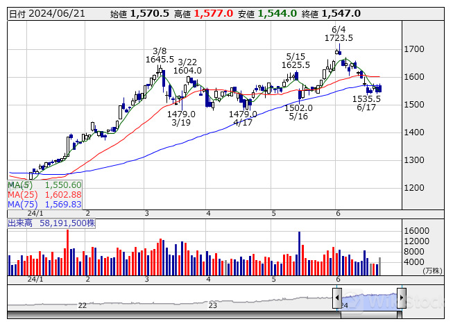 三菱UFJ <日足> 「株探」多機能チャートより/>