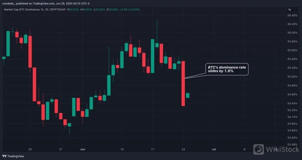 チャート作成プラットフォームのTradingViewによると、ビットコインのドミナンス(暗号資産市場全体の時価総額に占める割合)は1.8%マイナスの54.34%となり、1日あたりの低下率としては、1月12日以来の大きさとなった。つまり、投資家はビットコインからアルトコインよりも早く資金を引き上げた可能性が高い。