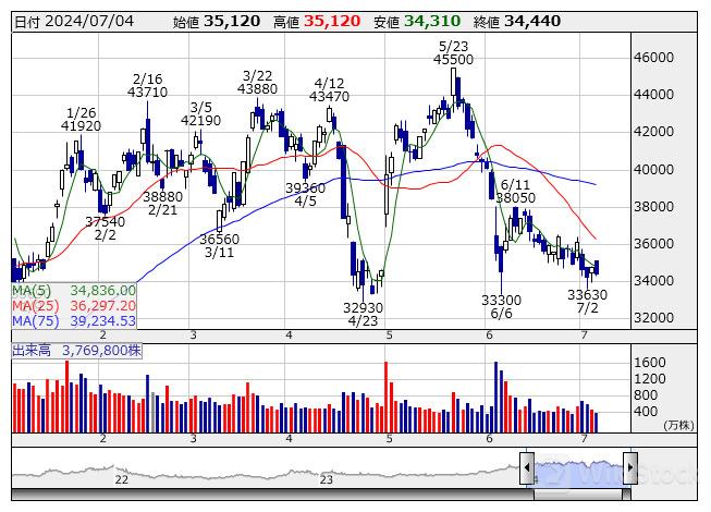 レーザーテク <日足> 「株探」多機能チャートより/>