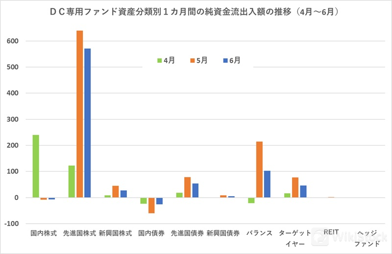 ただ、公募投信市場でおいては、「野村 世界業種別投資シリーズ(半導体)」が1年トータルリターンで103%という成績をあげている。これに対して、DC専用ファンドのトップパフォーマーが63%にとどまるというのは、大きく見劣りする。「野村 世界業種別投資シリーズ(半導体)」は過去10年パフォーマンスでもカテゴリーでトップの成績になるなど、長期にわたって良いパフォーマンスをあげ続けているファンドだ。その結果、純資産総額も4600憶円を超えるほど大きなファンドになった。DC市場も、より柔軟に人気商品の品ぞろえが進むような状態が望ましいのではないだろうか。(グラフは、過去3カ月間のDC専用ファンドの資産クラス別資金流出入の状況)