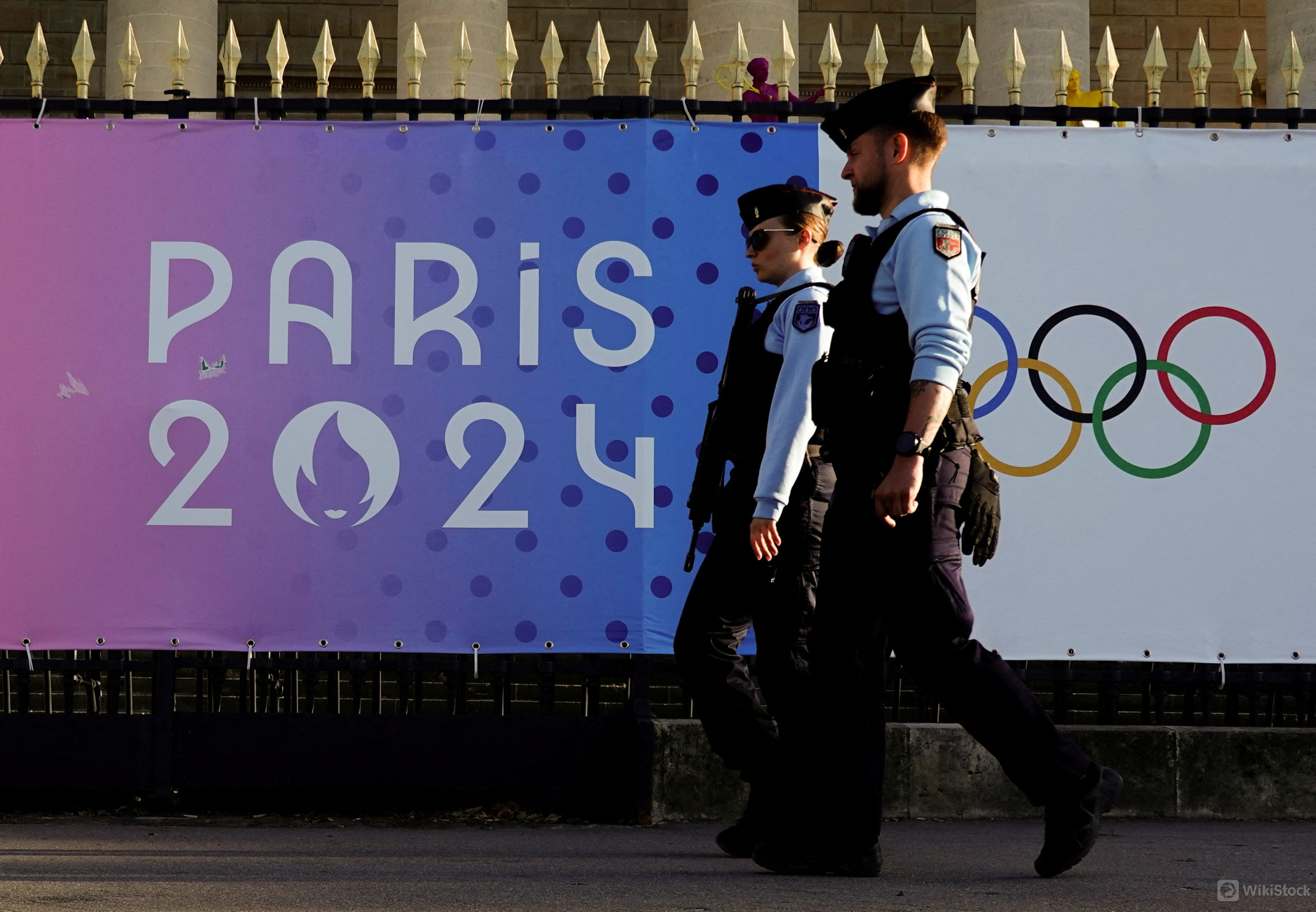 7月4日、 パリ五輪は経済効果にも期待がかかっているが、実際には旅費や宿泊費の高騰、フランスの政情不安や治安への懸念から多くのスポーツファンや観光客がパリ行きを避けており、予約は低調だ。写真は6月、パリに掲示された五輪のポスター前を警備する警察官(2024年 ロイター/Pawel Kopczynski)/>