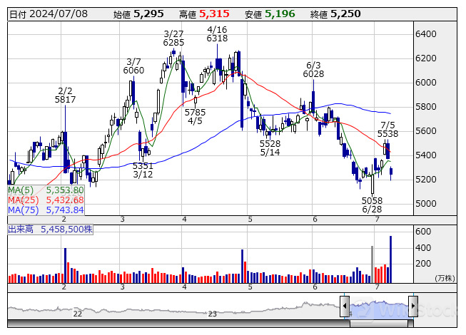 アイシン <日足> 「株探」多機能チャートより/>