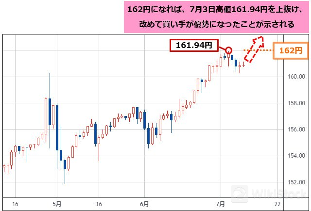 162円になれば、7月3日(水)高値161.94円を上抜け、改めて買い手が優勢になったことが示されます。