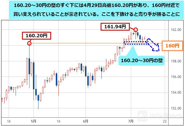 一方、160円の手前には、6月27日(木)安値160.27円、6月28日(金)安値160.25円、7月5日(金)安値=160.32円、7月8日(月)安値160.25円が並び、160.20~30円ぐらいに相場の壁があることがわかります。