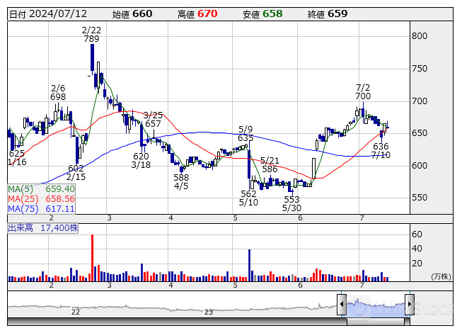 レシップHD <日足> 「株探」多機能チャートより/>