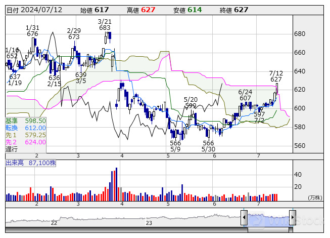 グランディ <日足> 一目均衡表 「株探」多機能チャートより/>