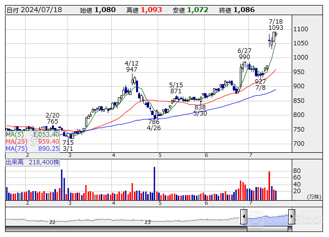 「株探」集計によると、本決算月にかかわらず、3-5月期の決算発表を終えた435社のうち、経常利益が前年同期比で増益または黒字転換した企業は221社だった。下表では、この221社の中から、時価総額100億円以上の銘柄を対象に、3-5月期の経常利益が前年同期比で50%以上の大幅増益を達成した31社を選び出し、増益率の高い順に記した。