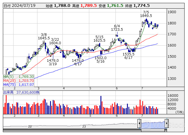 三菱UFJ <日足> 「株探」多機能チャートより/>