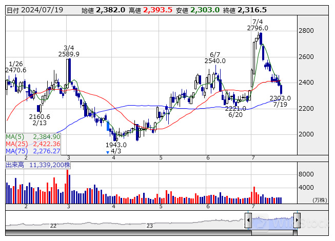 川崎汽 <日足> 「株探」多機能チャートより/>