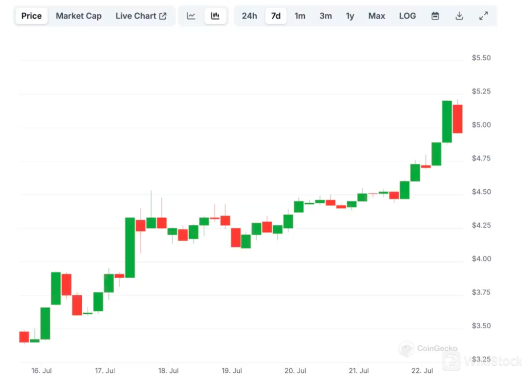 HNTの価格は7日間で40%以上急騰し、5ドルに達した。Coingeckoのデータによると、時価総額上位100コインの値上がり率ランキングで、ミームコインのドッグウィフハット(WIF)に次ぐ第2位になった。時価総額で最大の暗号資産(仮想通貨)であるビットコイン(BTC)は7%上昇し、より広範な市場の指標であるCoinDesk20指数(CD20)も同様に上昇した。