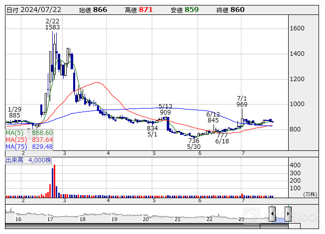 ピクスタ <日足> 「株探」多機能チャートより/>