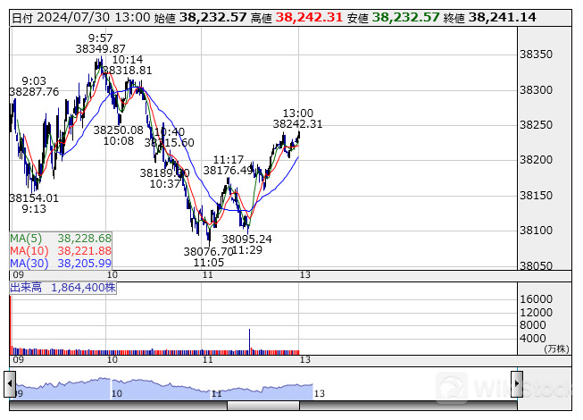 13時の日経平均は236円安の3万8232円、ファストリが48.06円押し下げ