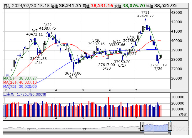 安値 38076.70(11:05)