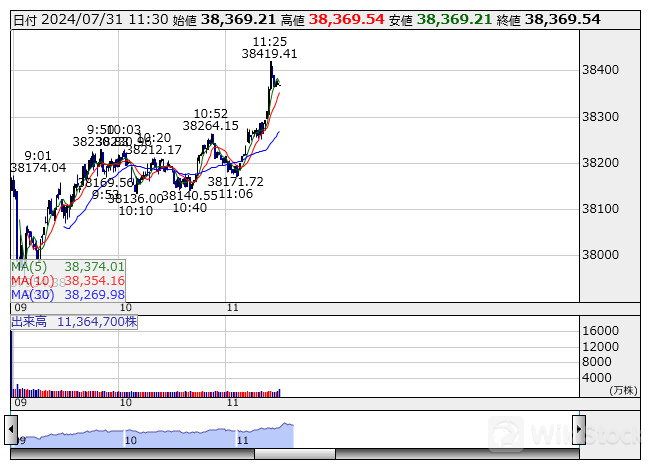 31日前引けの日経平均株価は3日ぶり反落。前日比156.41円(-0.41%)安の3万8369.54円で前場の取引を終...