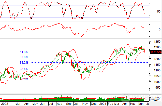 Hiện tại, chỉ số đang test lại ngưỡng Fibonacci Projection 61.8% (tương đương vùng 1,255-1,265 điểm) trong bối cảnh chỉ báo MACD đang không ngừng mở rộng khoảng cách với đường Signal sau khi cho tín hiệu bán trước đó. Nếu tín hiệu bán được duy trì và chỉ số tiếp tục rơi khỏi vùng hỗ trợ này thì kịch bản điều chỉnh ngắn hạn có thể xảy ra trong các phiên tới.