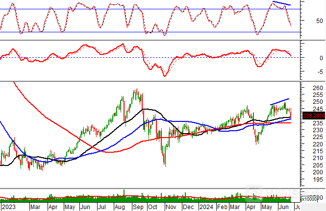 Bên cạnh đó, HNX-Index đang test lại nhóm đường SMA 50 ngày và SMA 100 ngày trong bối cảnh chỉ báo Stochastic Oscillator tiếp tục hướng đi xuống sau khi cho tín hiệu bán trước đó. Trong kịch bản cẩn trọng hơn, chỉ số tiếp tục xuyên thủng ngưỡng hỗ trợ này trong các phiên tới thì mục tiêu giá (price target) tiếp theo sẽ là vùng 232-235 điểm.