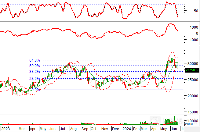 Bên cạnh đó, giá cổ phiếu đang test lại ngưỡng Fibonacci Projection 38.2% (tương đương vùng 26,800-28,300) trong bối cảnh chỉ báo MACD tiếp tục mở rộng khoảng cách với đường Signal sau khi cho tín hiệu bán trước đó. Nếu tín hiệu bán được duy trì và giá cổ phiếu rơi khỏi vùng hỗ trợ này thì rủi ro điều chỉnh sẽ tăng cao trong các phiên tiếp theo.