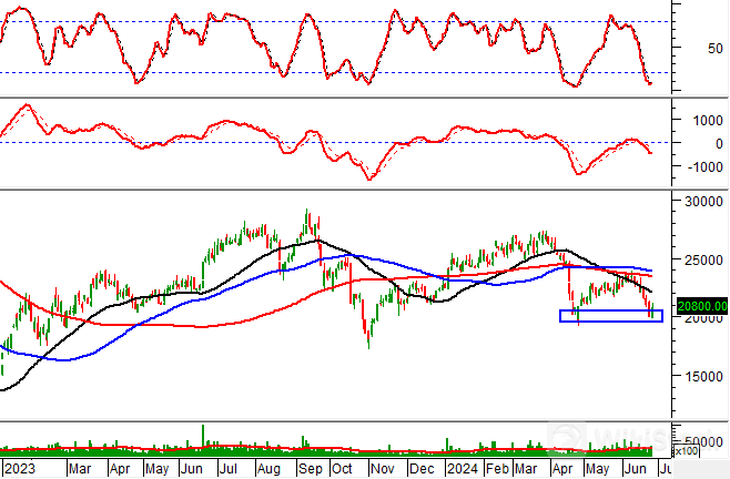Hiện tại, giá cổ phiếu đang test lại đáy cũ tháng 4/2024 (tương đương vùng 19,500-20,500) trong bối cảnh chỉ báo Stochastic Oscillator sắp cho tín hiệu mua tại vùng quá bán (oversold). Nếu tín hiệu mua xuất hiện thì triển vọng phục hồi có thể quay trở lại trong các phiên tới.