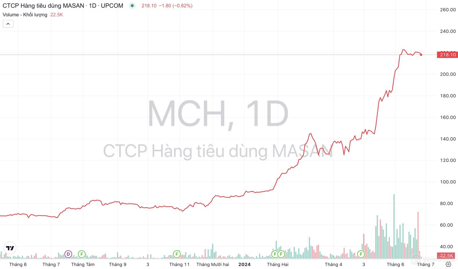 Trên thị trường chứng khoán, cổ phiếu MCH của Masan Consumer đang giao dịch quanh vùng đỉnh lịch sử với giá tham chiếu đạt 219.300 đồng/cổ phiếu, tăng gần 220% trong 12 tháng qua. Qua đó, giá trị vốn hoá thị trường của Masan Consumer đạt tới 157.780 tỷ đồng, tương đương 6,2 tỷ USD, trở thành doanh nghiệp lớn bậc nhất trong ngành thực phẩm đồ uống trên thị trường chứng khoán Việt Nam.