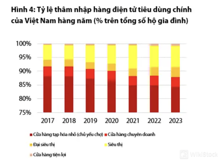 Về thị phần cụ thể, dựa trên khoảng 12% thị phần kênh hiện đại so với xấp xỉ 84% thị phần của cửa hàng tạp hóa nhỏ lẻ, cho thấy tiềm năng tăng trưởng đáng kể trong việc mở rộng thị phần của các chuỗi này trong những năm tới. Trong khi đó, sự phát triển của ngành bán lẻ tạp hóa hiện đại ở Việt Nam còn kém xa so với các nước Đông Nam Á.