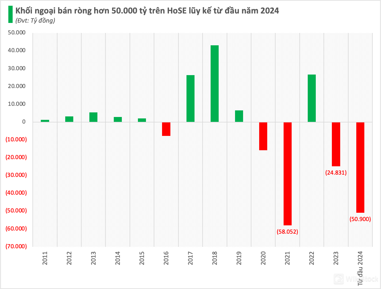 Với đà bán ròng hàng trăm tỷ, thậm chí lên tới hơn nghìn tỷ đồng mỗi phiên, không quá bất ngờ khi giá trị bán ròng của nhà đầu tư nước ngoài trên TTCK Việt Nam liên tục đạt cột mốc mới. Theo thống kê, nhà đầu tư ngoại đã bán ròng vượt mốc 50.000 tỷ đồng (xấp xỉ 2 tỷ USD) trên sàn HoSE tính từ đầu năm 2024.