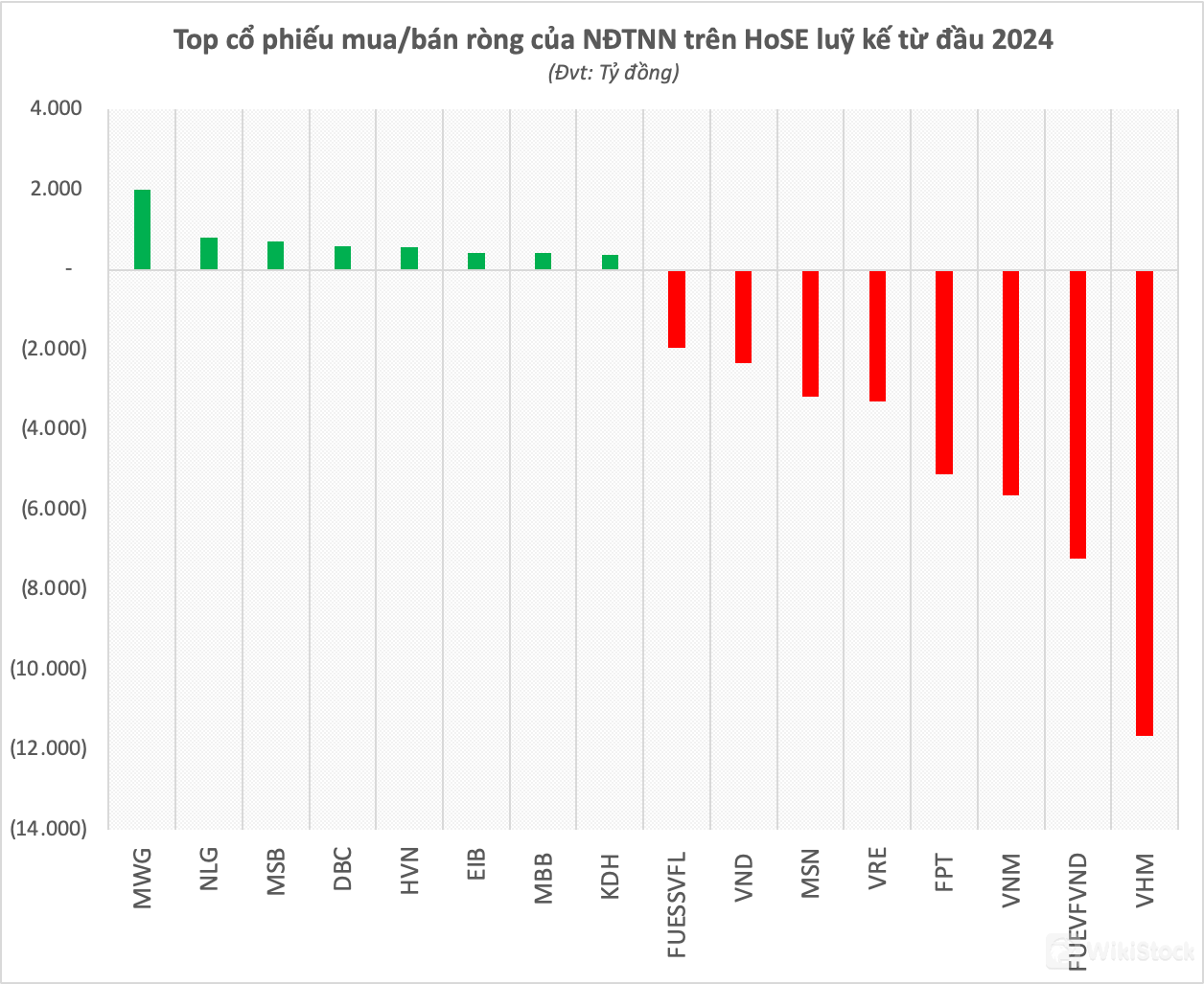 Lượng bán ròng mạnh nhất từ đầu năm tới nay ghi nhận tại cổ phiếu bất động sản Vinhomes - VHM với giá trị xấp xỉ 12.000 tỷ đồng, trong đó khoảng 9.000 tỷ đồng cổ phiếu bị bán ròng khớp lệnh. Xếp tiếp theo trong danh sách bán ròng của khối ngoại là chứng chỉ quỹ FUEVFVND với giá trị bán ròng hơn 7.200 tỷ đồng. Hai cổ phiếu bluechips khác là VNM và FPT cũng bị bán ròng lần lượt hơn 5.600 tỷ và hơn 5.100 tỷ đồng.