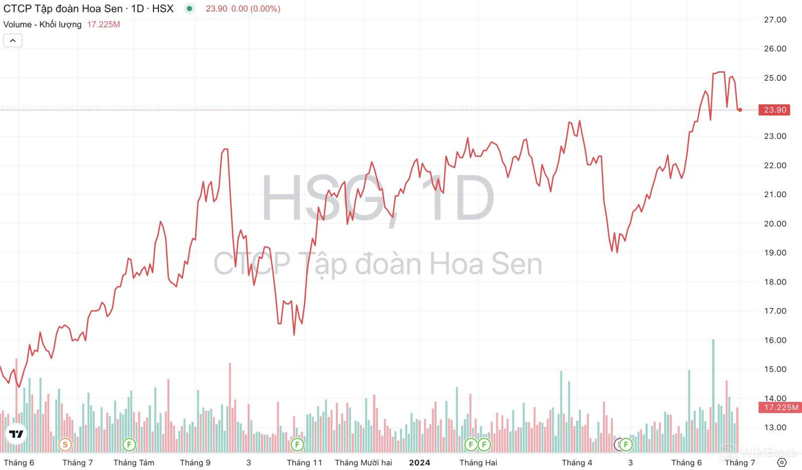 Diễn biến giá và khối lượng giao dịch cổ phiếu HSG của Tập đoàn Hoa Sen trong 12 tháng qua. (Nguồn: TradingView)
