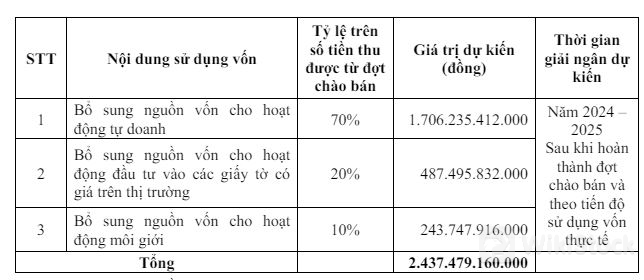Đối với phương án chào bán cho cổ đông hiện hữu, Công ty sẽ chào bán 243.7 triệu cp, giá 10,000 đồng/cp. Số vốn từ đợt chào bán cho cổ đông hiện hữu sẽ được phân bổ chủ yếu vào hoạt động tự doanh (70%). Nguồn vốn còn lại bổ sung cho hoạt động đầu tư các giấy tờ có giá (20%) và hoạt động môi giới (10%).