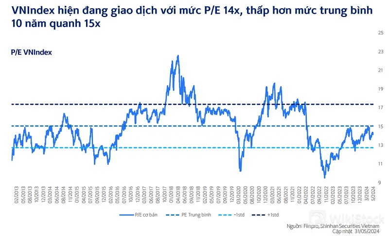 Cùng với sự phục hồi của nền kinh tế, thị trường chứng khoán cũng đã có nhịp phục hồi tích cực từ cuối năm 2023. Tuy nhiên, hiện VN-Index đang giao dịch ở mức định giá P/E quanh 14x, thấp hơn so với mức trung bình 10 năm là 15x, cho thấy tâm lý thị trường vẫn còn thận trọng. Thống kê theo nhóm ngành, có thể thấy lĩnh vực bất động sản và ngân hàng hiện đang có mức định giá P/E và P/B thấp hơn trung bình 5 năm gần đây trong khi các nhóm ngành khác đều có mức định giá tương đương hoặc đã cao hơn mức bình quân, phần nào phản ánh những rủi ro hiện tại của hai nhóm ngành này.