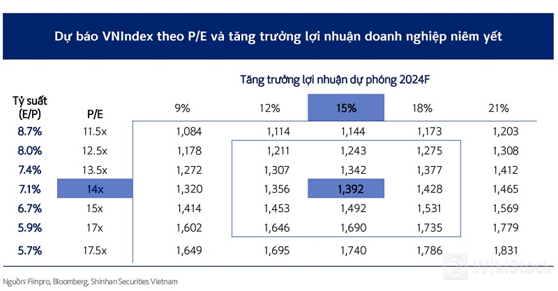 Như vậy, với P/E mục tiêu quanh vùng hiện tại 14x cùng kỳ vọng tăng trưởng lợi nhuận doanh nghiệp niêm yết ở mức 15%, chúng tôi ước tính ngưỡng hợp lý của VN-Index cho năm 2024 là vùng 1.390 điểm, tương ứng với mức tăng 23% so với thời điểm cuối năm 2023 và cao hơn 10% so với thời điểm hiện tại (cuối tháng 6/2023).