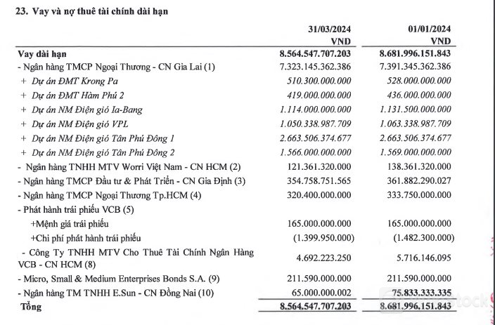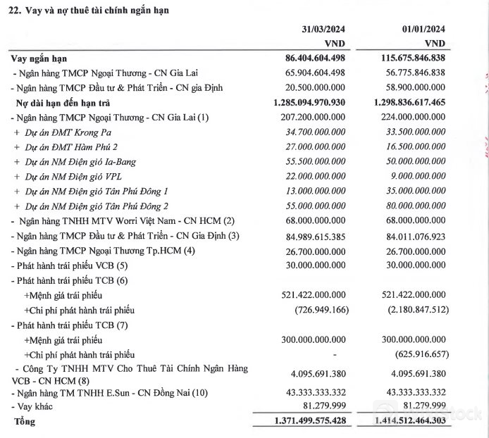 Ở bên kia bảng cân đối kế toán, dư nợ phải trả của GEC là 10.259 tỷ đồng, giảm 1,02% so với hồi đầu năm. Trong đó, Vay và thuê tài chính ngắn hạn là 1.371 tỷ đồng; Vay và thuê tài chính dài hạn là 8.564 tỷ đồng. Như vậy, tổng dư nợ vay thuê tài chính của GEC tính đến thời điểm cuối tháng 3/2024 là 9.936 tỷ đồng, chiếm 96,8% dư nợ phải trả của doanh nghiệp.