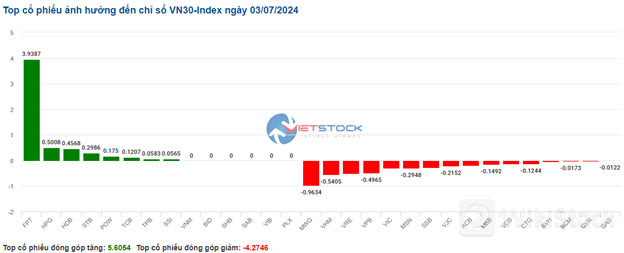 Các mã cổ phiếu như MWG, VHM, VRE và VPB đang tác động tiêu cực đến VN30-Index khi lần lượt lấy đi 0.96 điểm, 0.54 điểm, 0.51 điểm và 0.50 điểm từ chỉ số chung. Trái lại, FPT, HPG, HDB và STB là những mã trụ cột giúp VN30 níu giữ lại hơn 4.3 điểm.