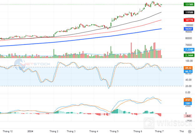 Ở góc nhìn phân tích kỹ thuật, trong phiên sáng 03/07/2024, cổ phiếu FPT tiếp tục bật tăng kèm theo khối lượng giao dịch trong phiên sáng có sự gia tăng so với phiên trước cho thấy tâm lý nhà đầu tư vẫn khá lạc quan. Hiện tại, FPT liên tục tạo các đỉnh và đáy mới cao hơn (Higher High, Higher Low) sau khi xuất hiện tín hiệu giao cắt vàng (Golden Cross) trước đó giữa đường SMA 50 ngày và SMA 100 ngày cho thấy triển vọng tích cực trong dài hạn đang hiện hữu. Tuy nhiên, chỉ báo Stochastic Oscillator và MACD tiếp tục hướng đi xuống sau khi cho tín hiệu bán nên nhịp điều chỉnh trong ngắn hạn vẫn còn và SMA 50 ngày sẽ là mức hỗ trợ tốt cho cổ phiếu này trong thời gian tới.