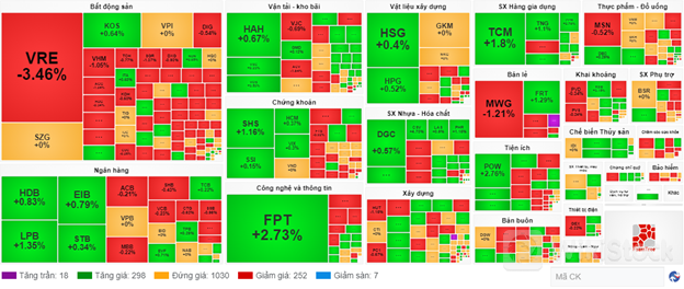 So với đầu phiên, số lượng các mã tham chiếu vẫn còn khá lớn với hơn 1,000. Tuy nhiên bên mua vẫn có phần lấn lướt hơn. Số mã tăng là 298 mã và số mã giảm là 252 mã.