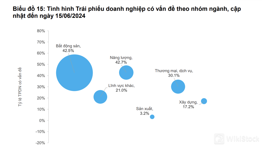 Về nhóm ngành, ngành Năng lượng có tỷ lệ trái phiếu doanh nghiệp có vấn đề lớn nhất 42,7%, tiếp đến là Bất động sản 42,5% và Thương mại, dịch vụ 30,1%. Tính trên giá trị lưu hành, tỷ lệ trái phiếu doanh nghiệp có vấn đề chứng kiến suy giảm nhẹ từ 15,4% vào cuối năm 2023 xuống 14,1% vào thời điểm 30/5/2024.