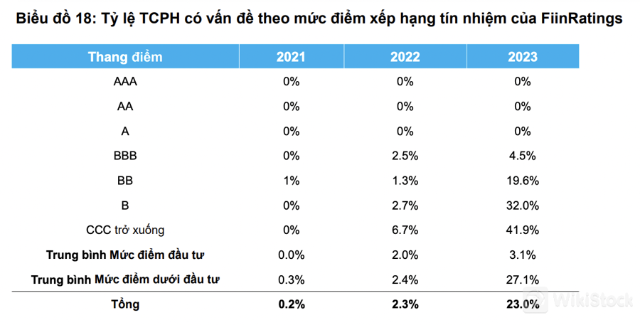 Giữa các nhóm ngành có tỷ lệ chậm trả tăng cao, dải điểm của ngành Bất động sản, Xây dựng và Năng lượng phần lớn nằm ở dưới mức điểm đầu tư. Các tổ chức phát hành trong nhóm điểm này thường là doanh nghiệp nhỏ chưa đảm bảo được độ nhận diện trên thị trường cũng như dòng tiền hoạt động ổn định. Các doanh nghiệp cũng chịu tác động đáng kể khi phải đối mặt với những diễn biến bất lợi của thị trường trong giai đoạn 2022 - 2023.