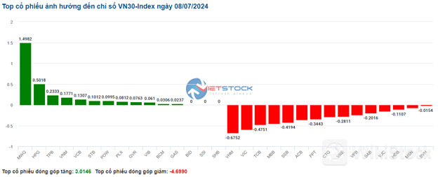 Các mã cổ phiếu có vốn hóa lớn như VCB, MWG và GAS dẫn đầu nhóm kéo chỉ số với mức tăng gần 1.5 điểm. Ở chiều ngược lại, các mã cổ phiếu như VHM, LPB và SSB đang đè thị trường với tổng mức kéo giảm gần 0.5 điểm.
