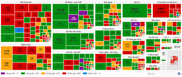 Ở chiều ngược lại, dòng ngành sản xuất nhựa – hóa chất đang là nhóm có đà phục hồi tốt nhất với mức tăng 1.41%. Trong đó, sắc xanh tích cực đang hiện diện ở các mã GVR tăng 1.42%, DGC tăng 0.56%, DCM tăng 3.33%, DPM tăng 1.47%, LAS tăng kịch trần…