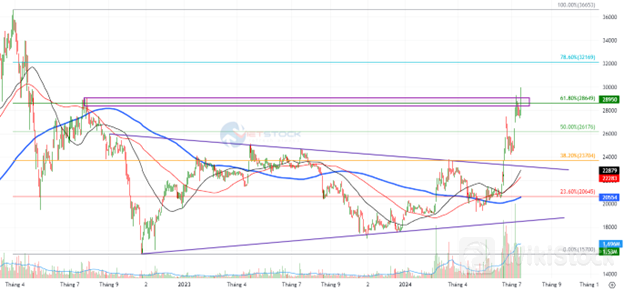 Tuy nhiên, giá cổ phiếu đang test lại đỉnh cũ tháng 7/2022 (tương đương vùng 28,400-29,000) trong bối cảnh Stochastic Oscillator đã cho tín hiệu bán trong vùng quá mua (overbought) nên rủi ro điều chỉnh ngắn hạn có thể xuất hiện khi chỉ báo rơi khỏi vùng này.