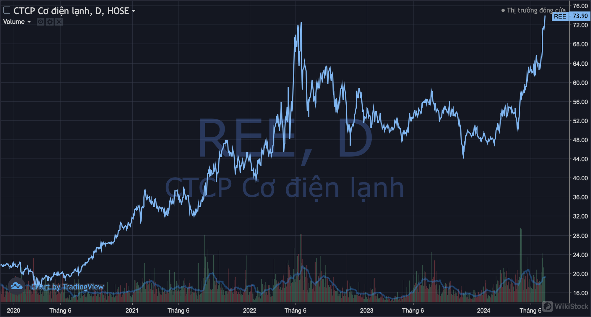 Trong khi VN-Index vẫn còn đang “loay hoay” dưới 1.300 điểm, một cổ phiếu Bluechip là REE lại âm thầm đi lên lập đỉnh mới. Từ đầu năm 2024 đến nay, cổ phiếu này đã tăng 52% lên mức 73.900 đồng/cp, cao nhất kể từ khi niêm yết. Giá trị vốn hóa của REE cũng theo đó lập kỷ lục hơn 34.700 tỷ đồng.