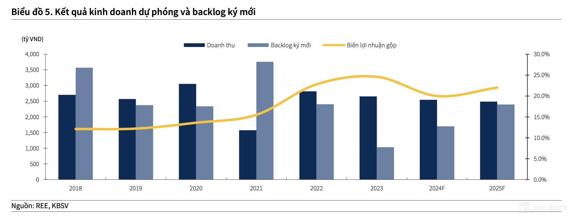 Với quan điểm doanh nghiệp sẽ tiếp tục duy trì khối lượng công việc lớn từ dự án sân bay Long Thành và tích cực tìm kiếm các cơ hội mới đón đầu đà hồi phục của ngành bất động sản, KBSV dự phóng backlog ký mới năm 2024 của REE cho mảng M&E đạt 1.104 tỷ đồng và sẽ giúp doanh thu 2.306 tỷ đồng.