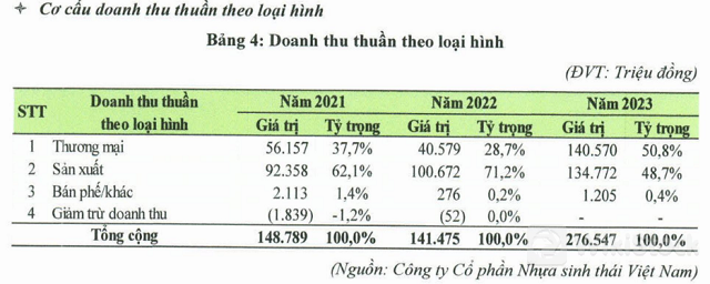 Doanh thu năm 2023 của ECO đạt khoảng 276 tỷ đồng, gần gấp đôi năm 2022, hoàn thành 98% kế hoạch nhờ tập trung đẩy mạnh hoạt động thương mại nhựa, tận dụng lợi thế nguồn cung nguyên liệu. Lãi sau thuế theo đó gấp 10 lần, ghi nhận 12.5 tỷ đồng. Tỷ trọng nguồn thu từ nội địa nâng lên gần 57% doanh thu, cao hơn nhiều so với mức 35% của năm 2022.