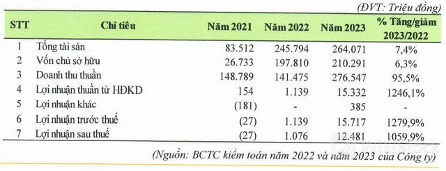 Đến cuối năm 2023, tổng tài sản khoảng 264 tỷ đồng, trong đó 13 tỷ đồng là tài sản cố định hữu hình, mà chủ yếu là máy móc và thiết bị. Vốn chủ sở hữu 210 tỷ đồng. Dư nợ vay ngân hàng hơn 40 tỷ đồng, đảm bảo bằng tài sản của Công ty hoặc quyền sử dụng đất và nhà ở của ông Nguyễn Văn Bình và bà Nguyễn Thị Lương.